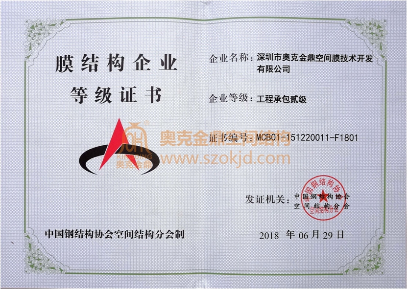 鋼結構工程安裝貳級,膜結構工程設計壹級,膜結構工程施工壹級,具備安全生產許可證。